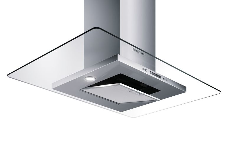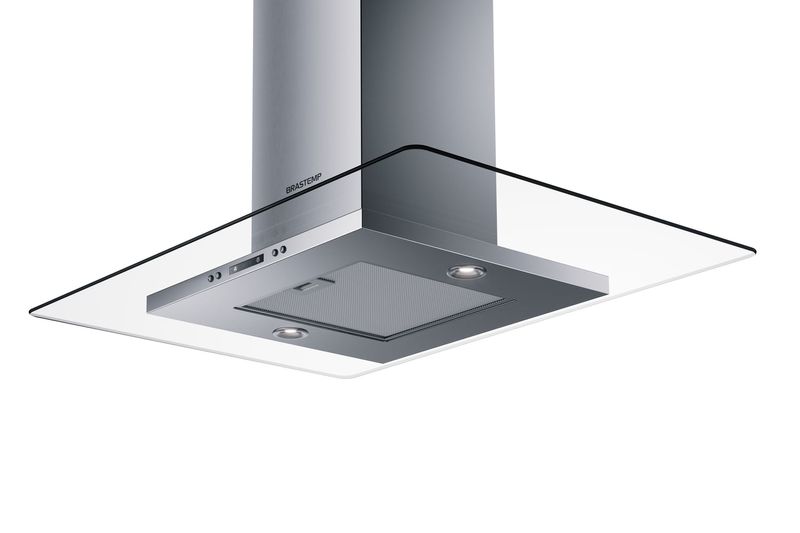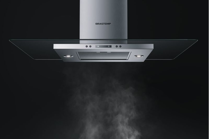 A coifa de vidro plano ilha Brastemp 100 cm oferece alto desempenho na remoção de fumaça, gordura e ...
