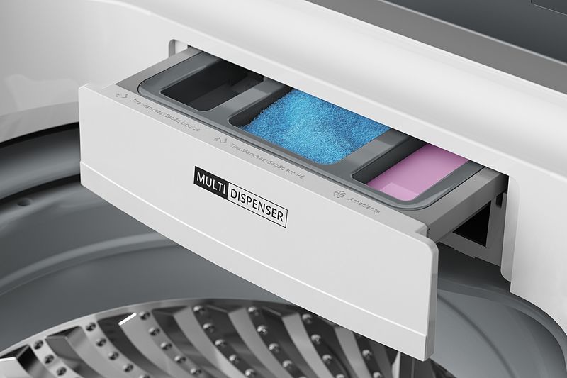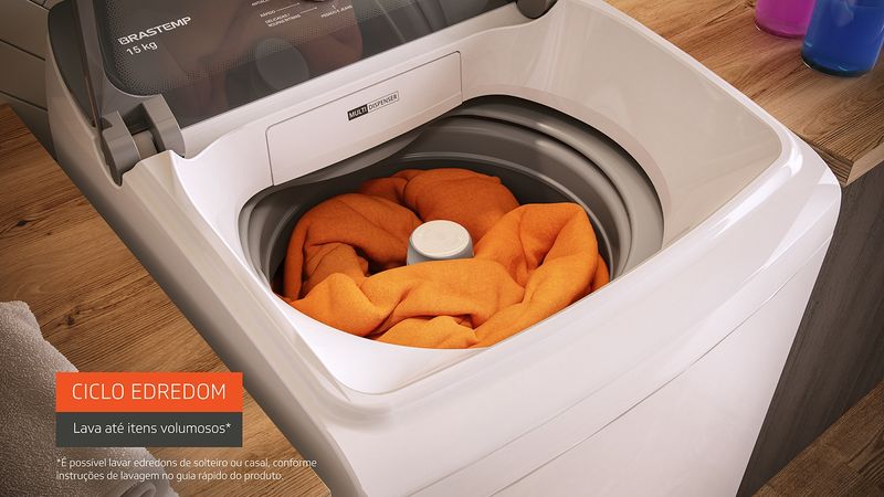 [2] Teste realizado com edredom dupla face casal 200 fios, tecido 100% algodão, enchimento 100% poliéster e dimensões 2,2 m x 2,4 m nas configurações padrão do ciclo, utilizando as quantidades de detergente em pó/líquido e amaciante recomendados.