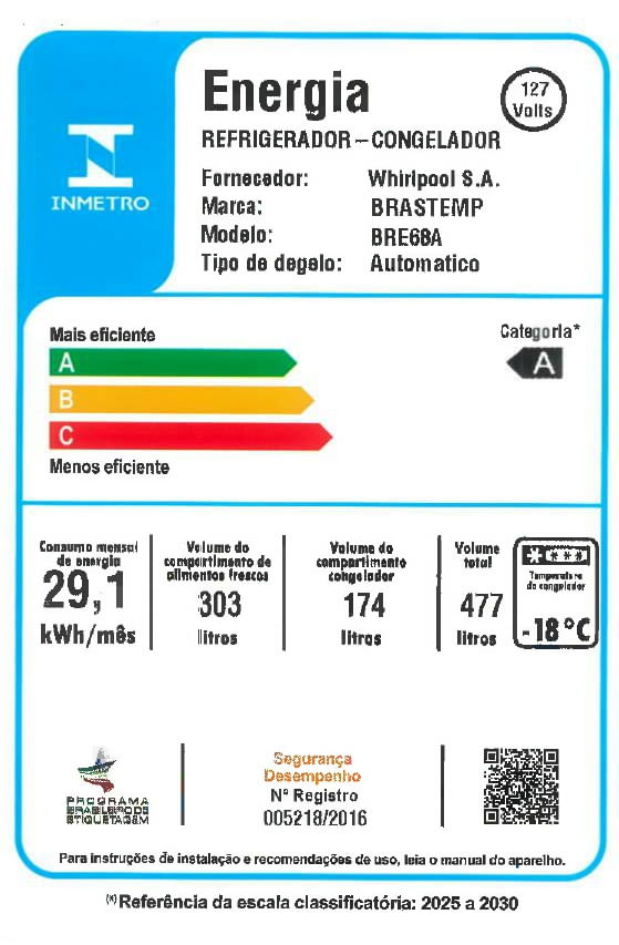 [1] Resultados obtidos a partir da média de testes internos com: pêra, repolho, tomate, nos modelos BRM62, BRE66 e BRE68. [2] Resultados obtidos a partir de testes internos. com os alimentos: maçã, pêra, kiwi, repolho, chuchu, tomate. [3] Resultados obtidos a partir de testes internos com bife de coxão mole bovino e filé de peito de frango. [4] Quando comparado a classificação energética da classe C (Padrões Mínimos de Eficiência Energética - Minimum Energy Performance Standards - MEPS) no padrão INMETRO (Norma IEC 62552-3:2020). [5] Maior capacidade líquida do compartimento freezer, considerando geladeiras 2 portas (com freezer embaixo), plataforma 70cm do mercado, segundo a GFK FY'2024. [6] Medidas das refeições congeladas: 150 x 100 x 40mm [7] Teste realizado conforme procedimento interno, que simula carne congelada (conforme pacote da IEC 62552-1:2015 Anexo C) do momento da queda de energia até -6°C, com temperatura ambiente de 25ºC, sem aberturas de portas no período sem energia. [8] Modelos Cor Inox e Black Inox. Conforme política de garantia descrita no manual do produto, a garantia cobre defeitos de fabricação, mas não inclui danos causados por mau uso. [9] Mais de 100 testes, incluindo os exigidos pela regulamentação vigente.