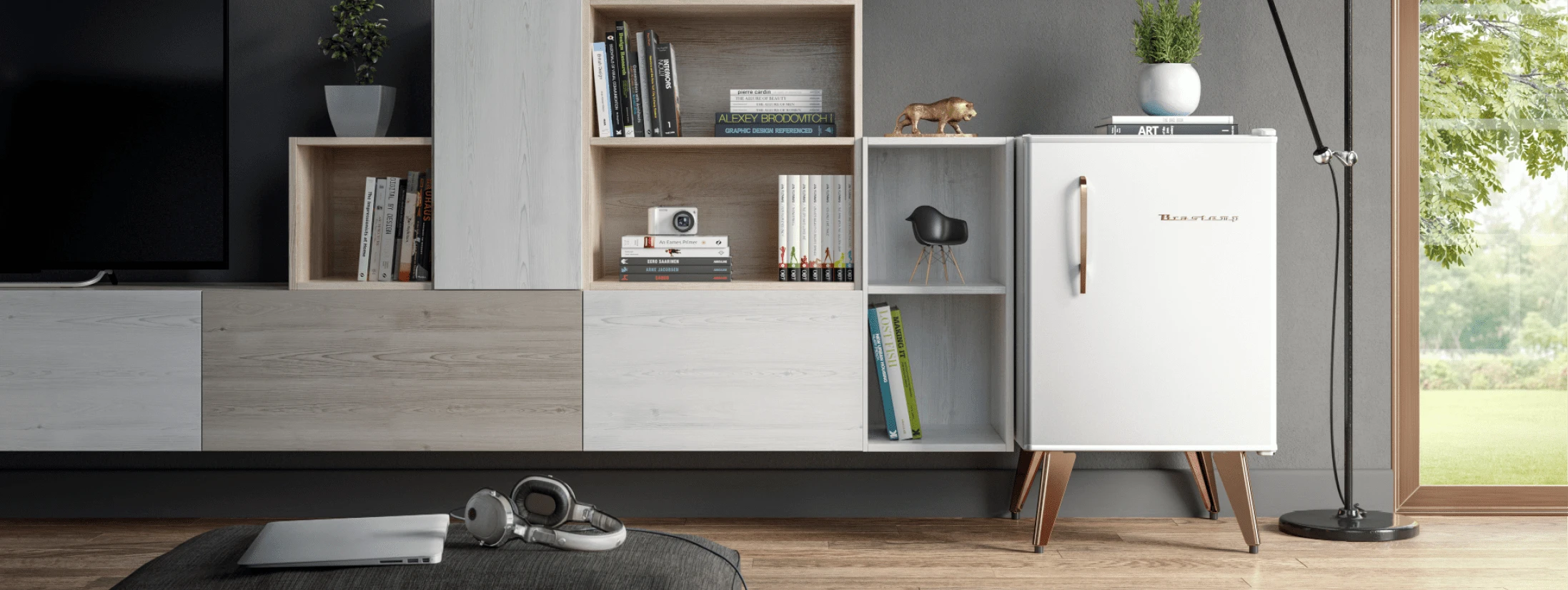 Um exemplo excelente é a linha Brastemp Retrô, com seu Frigobar Retrô de 76 litros, que resgata os pés-palito, o clássico logo “Brastemp” e o puxador, ambos originais da marca dos anos 50, porém casa isso tudo com cores e acabamentos inspirados nas tendências mais atuais de design. Sua cores vivas e metálicas deixam a decoração mais moderna e criam esse interessante diálogo entre o vintage e o novo.
