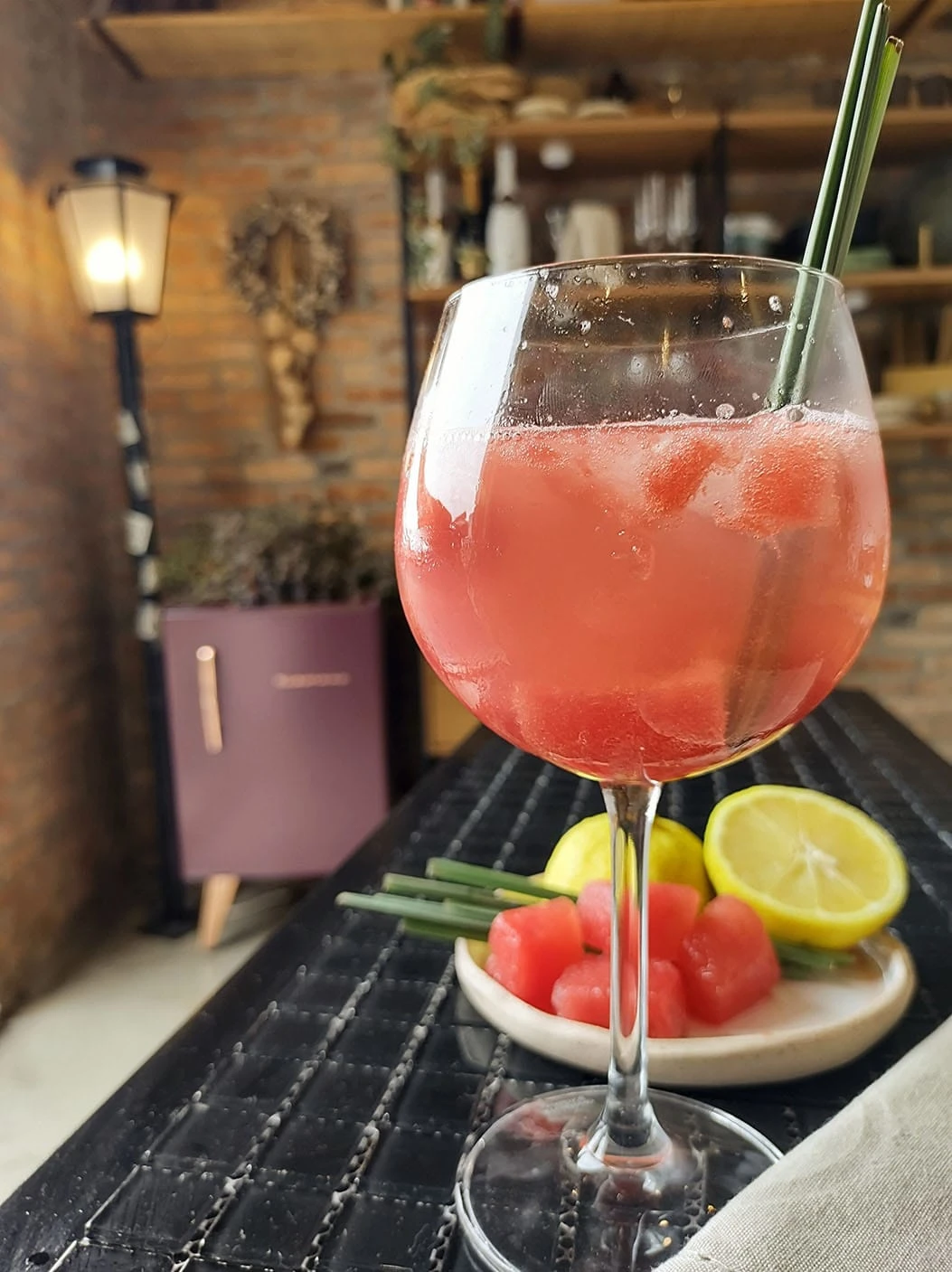 – 1 dose de rum– 6 cubinhos de melancia– Suco de meio limão siciliano– 5 a 6 tirinhas de capim limão– Uma colher de açúcar– Gelo– Água gasosa