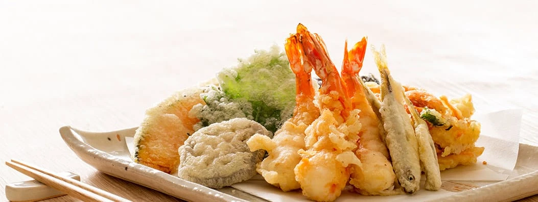 Tempura é um prato que consiste em frutos do mar como camarão, lula e badejo japonês, e vegetais diversos.