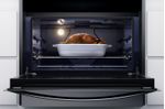 "O forno tem duas prateleiras: a superior tem altura ajustável e a inferior desliza automaticamente ao abrir a porta do forno, o que facilita colocar e retirar os alimentos."