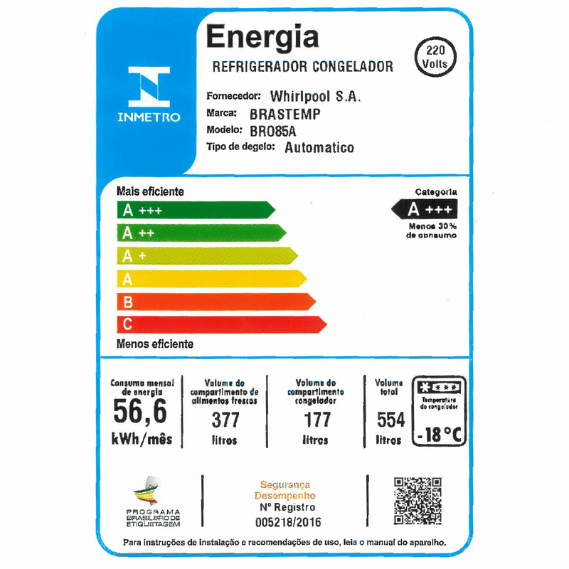 A Geladeira Brastemp BRO85AB possui 554 litros de capacidade e classificação A+++ em eficiência ener...