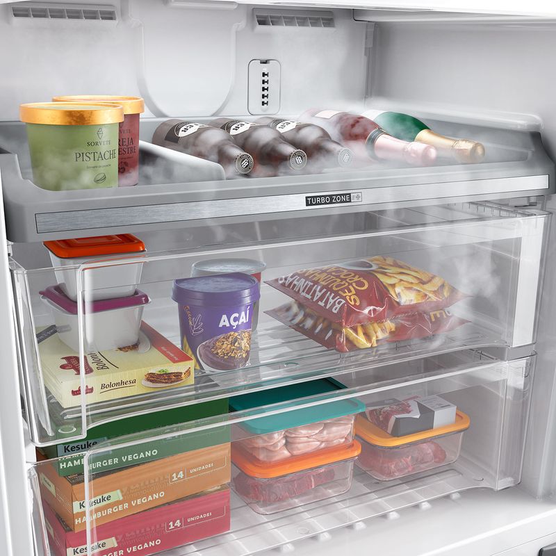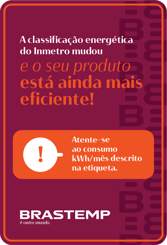 [1] Quando comparado ao modelo BRH85 com etiqueta A+++ INMETRO 2024, avaliado na norma vigente a partir de 2026. [2] Resultados obtidos a partir de testes baseados em normas internas Whirlpool, com tomate, maçã, kiwi, pera, pimentão e chuchu. [3] Teste realizado conforme procedimento interno, que simula carne congelada (conforme pacote da IEC 62552-1:2015 Anexo C) do momento da queda de energia até -6°C, com temperatura ambiente de 25ºC, sem aberturas de portas no período sem energia. [4] Conforme política de garantia descrita no manual do produto, a garantia cobre defeitos de fabricação, mas não inclui danos causados por mau uso.