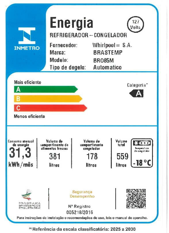 *Quando comparado ao modelo BRO85 com etiqueta A+++ INMETRO 2024, avaliado na norma vigente a partir de 2026.