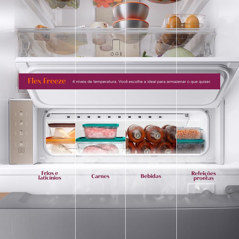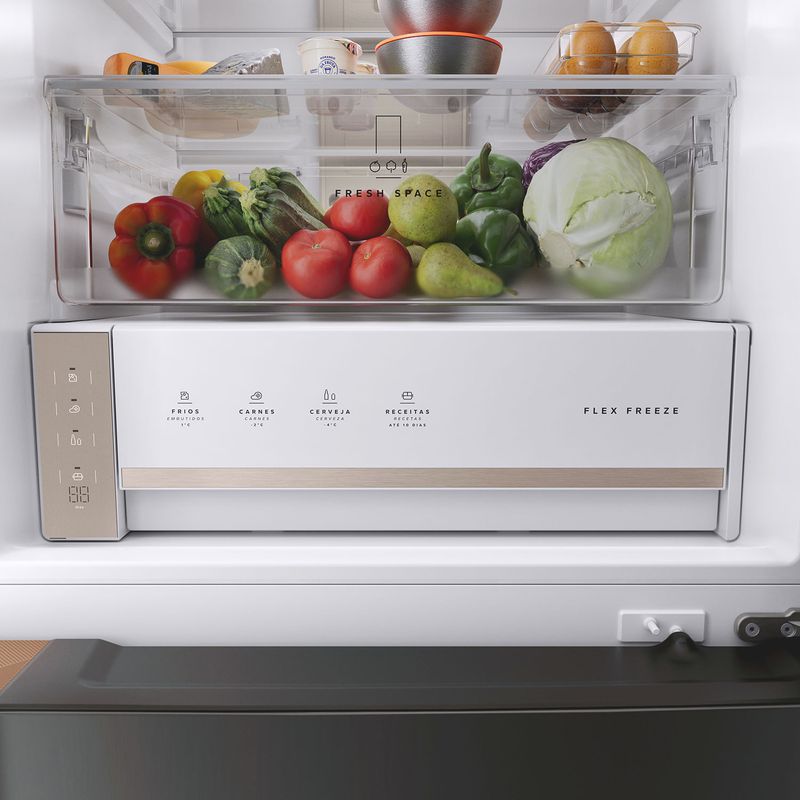 [5] Maior capacidade líquida do compartimento freezer, considerando geladeiras 2 portas (com freezer embaixo), plataforma 70cm do mercado, segundo a GFK FY'2024.