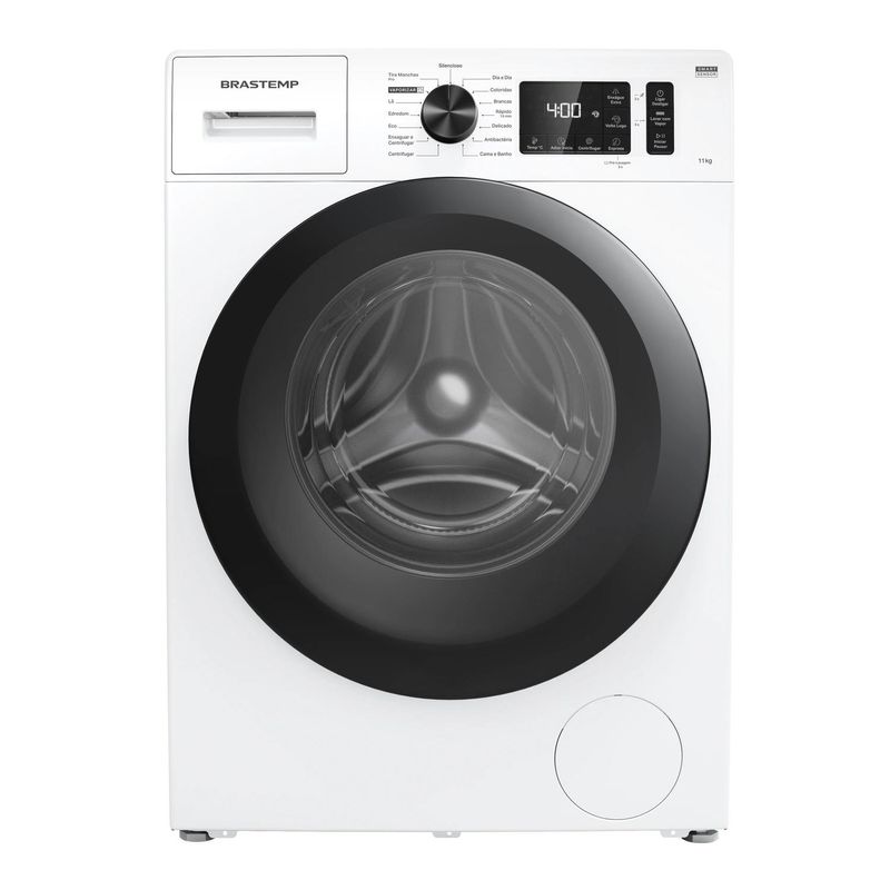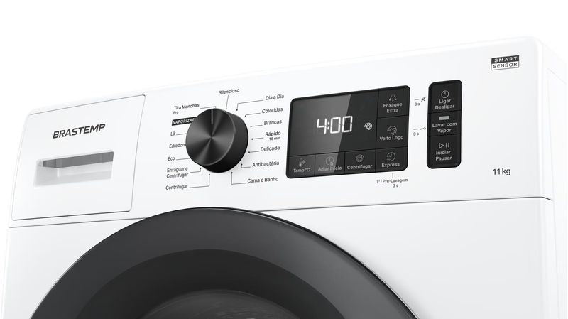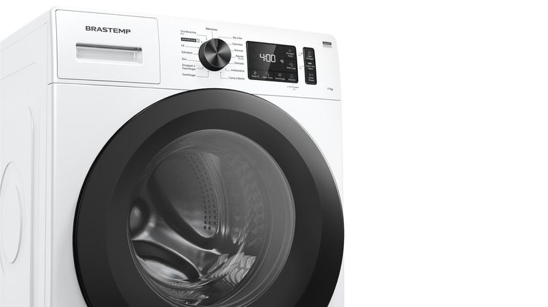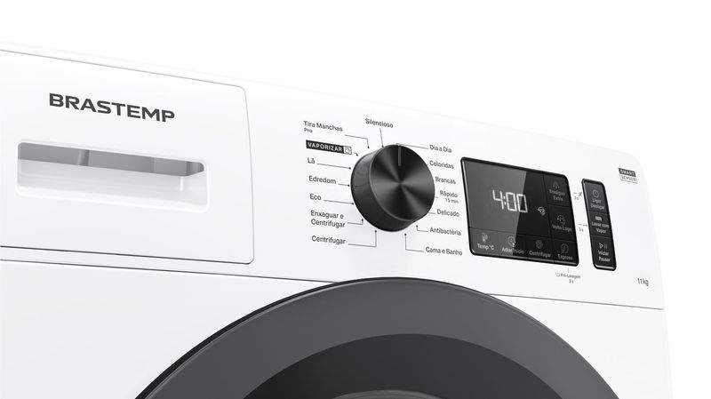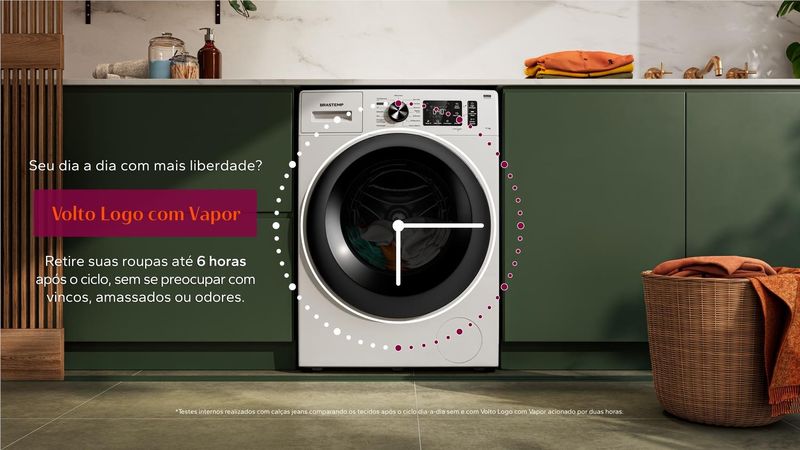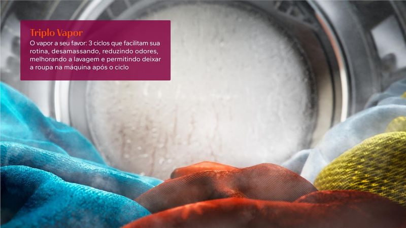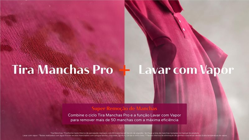 [4] Testes internos: redução de até 40% de vincos em algodão, alta remoção de odores, manchas difíceis (sangue, chocolate, gordura, carvão, vinho) em água fria, elimina germes com vapor, previne amassados em jeans (ciclo 2h). Detalhes no manual.