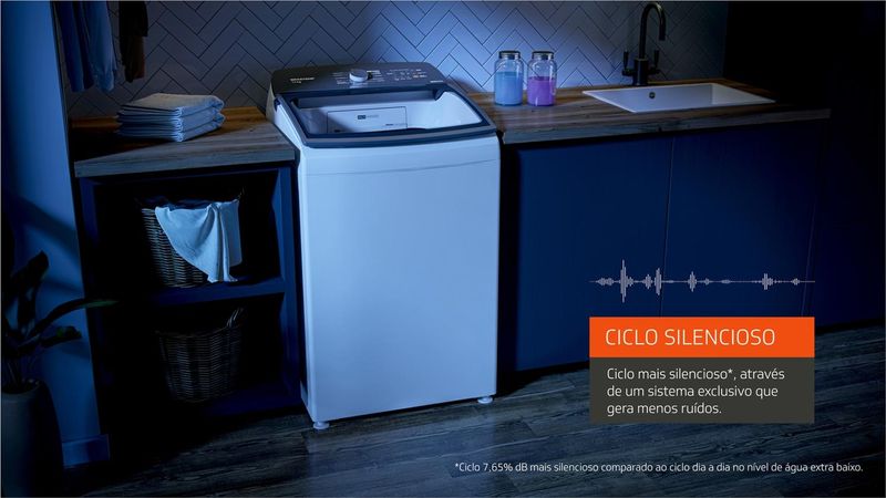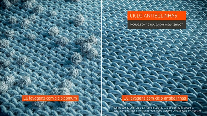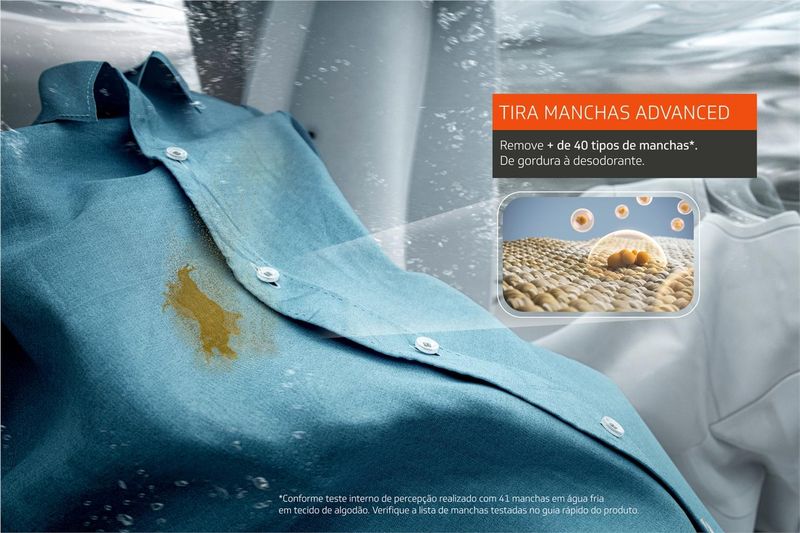 [1] Conforme teste interno de percepção realizado com 41 manchas em água fria em tecido de algodão. Verifique a lista de manchas testadas no guia rápido do produto. [2] Teste realizado com edredom dupla face casal 200 fios, tecido 100% algodão, enchimento 100% poliéster e dimensões 2,2 m x 2,4 m nas configurações padrão do ciclo, utilizando as quantidades de detergente em pó/líquido e amaciante recomendados. [3] Economia de água calculada com base em 2kg de carga no nível de água 4 vs. nível automático. [4] Comparado ao ciclo "dia a dia" na configuração padrão da mesma lavadora. Teste interno realizado em tecidos meia-malha (Jersey), 94% algodão, 6% elastano. [5] Comparado ao ciclo "dia a dia" na configuração padrão da mesma lavadora por meio de teste interno. [6] 7,65% dB mais silencioso comparado ao ciclo dia a dia em baixo nível extra baixo [7] Comparado ao ciclo "dia a dia" na configuração padrão da mesma lavadora por meio de teste interno. [8] Comparado ao ciclo "dia a dia" na configuração padrão da mesma lavadora por meio de teste interno. [9] Produto classificado como IPX4 de acordo com a cláusula 7.1 da NBR NM-IEC 335-1 e NM-IEC 60335-2-4. [10] Produto classificado como IPX4 de acordo com a cláusula 7.1 da NBR NM-IEC 335-1 e NM-IEC 60335-2-4.