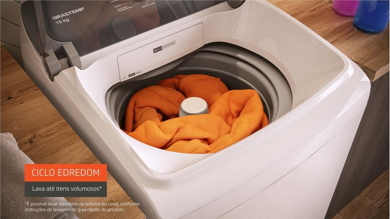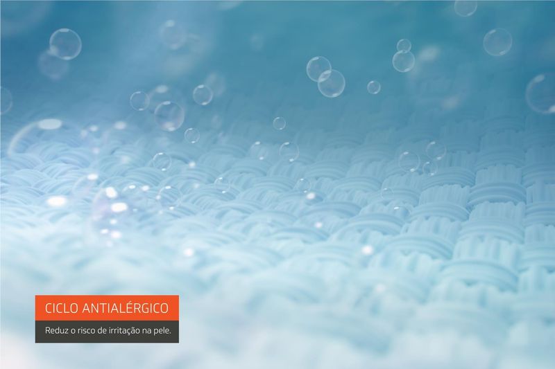 [2] Teste realizado com edredom dupla face casal 200 fios, tecido 100% algodão, enchimento 100% poliéster e dimensões 2,2 m x 2,4 m nas configurações padrão do ciclo, utilizando as quantidades de detergente em pó/líquido e amaciante recomendados.