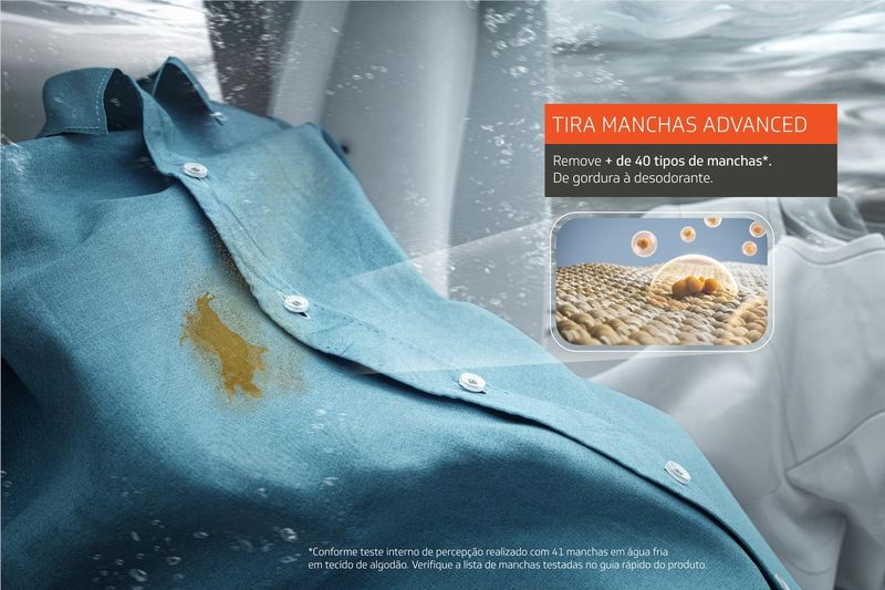 [1] Conforme teste interno de percepção realizado com 41 manchas em água fria em tecido de algodão. Verifique a lista de manchas testadas no guia rápido do produto.