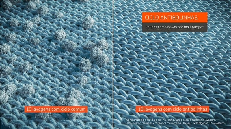 [4] Comparado ao ciclo "dia a dia" na configuração padrão da mesma lavadora. Teste interno realizado em tecidos meia-malha (Jersey), 94% algodão, 6% elastano.